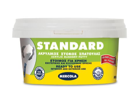 Ο STANDARD είναι έτοιμος για χρήση, λευκός ακρυλικός στόκος οικοδομών εσωτερικής και εξωτερικής χρήσης. Είναι κατάλληλος για σπατουλάρισμα τοίχων και οροφών. Ιδανικός για να γεμίζει ρωγμές και τρύπες σε τοιχοποιίες, ταβάνια, πατώματα και πόρτες. Εφαρμόζεται σε σοβά, τούβλο, μπετόν, πέτρα και ξύλα.
